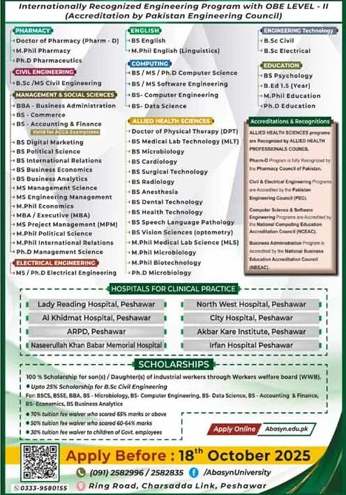 Last date to apply for Abasyn University AU Peshawar admission 2025 is 18 October, 2025