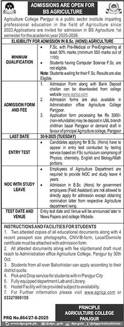 Last date to apply for Agriculture College Panjgur AC Panjgur admission 2026 is 30 September, 2025