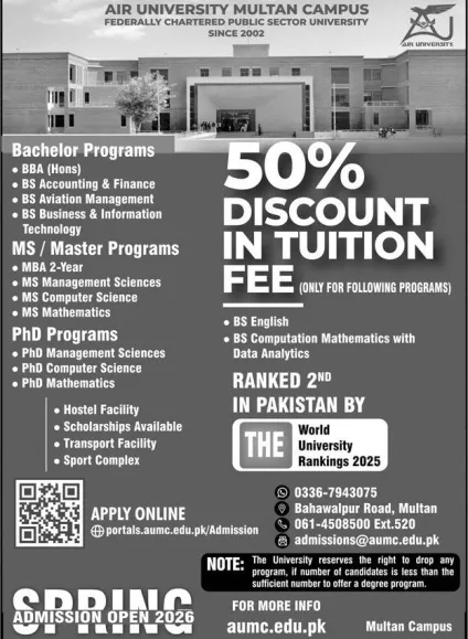 Air University, Multan Campus Multan admission office has announced that admission are open for session 2026.