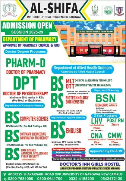 Al-shifa Institute Of Health Sciences Narowal admission office has announced that admission are open for session 2026.