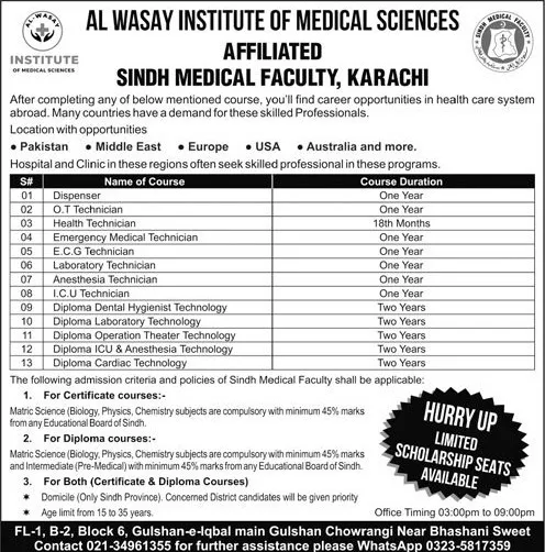 Interested applicants are informed that Al Wasay Institute Of Medical Sciences, Karachi admission are open and you can submit the applicaiton at the earliest time.