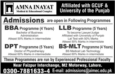 Interested applicants are informed that Amna Inayat Medical & Educational Campus, Lahore admission are open and you can submit the applicaiton at the earliest time.