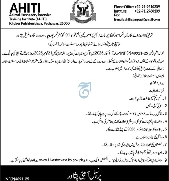 Last date to apply for Animal Husbandry In Service Training Institute AHITI Peshawar admission 2025 is 21 November, 2025