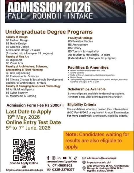 Aror University Of Art, Architecture, Design And Heritage Sukkur admission office has announced that admission are open for session 2026.