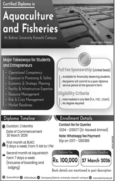 Bahria University ( Karachi Campus ) ( BU) admission 2026 for DIPLOMA / CERT (After INTER) Courses / Degrees