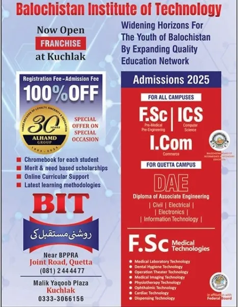 Balochistan Institute Of Technology ( BIT) admission 2025 for INTERMEDIATE / A-LEVEL Courses / Degrees