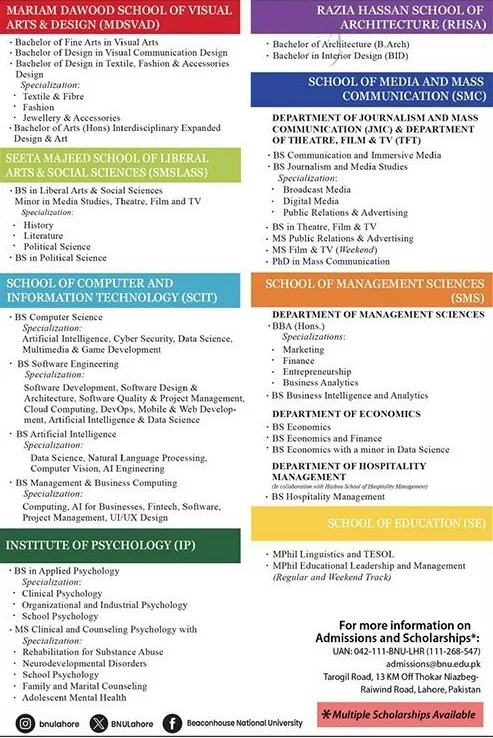 Beaconhouse National University BNU Lahore Admission 2025 Last date
