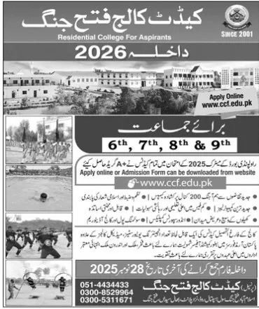 Cadet College Fatah Jang admission office has announced that admission are open for session 2025.