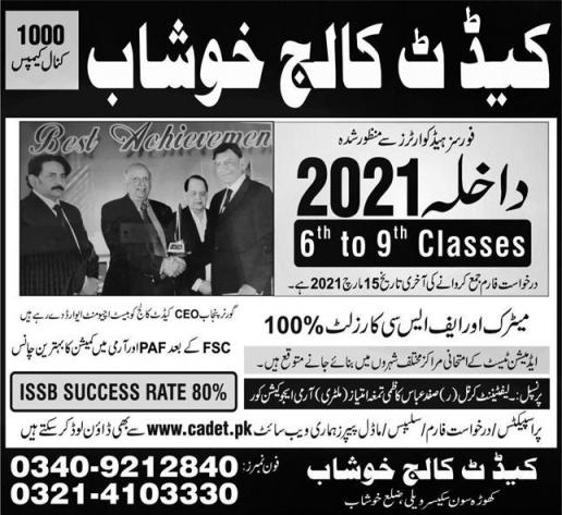 Interested applicants are informed that Cadet College, Khushab admission are open and you can submit the applicaiton at the earliest time.