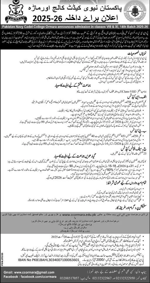 Cadet College Ormarah admission office has announced that admission are open for session 2025.