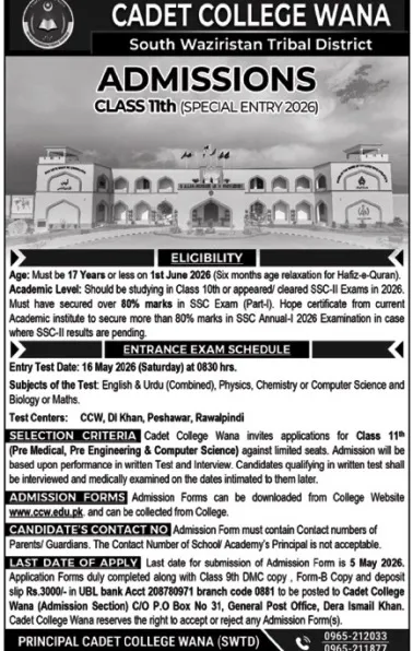 Last date to apply for Cadet College CCW Wana admission 2026 is 05 May, 2026