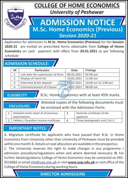 Last date to apply for College Of Home Economics CHE Peshawar admission 2025 is 08 February, 2021