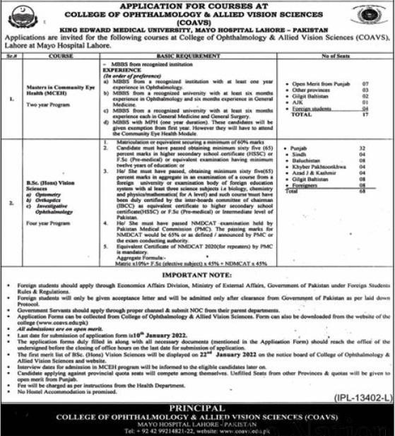 Last date to apply for College Of Ophthalmology & Allied Vision Sciences COAVS Lahore admission 2026 is 10 January, 2022