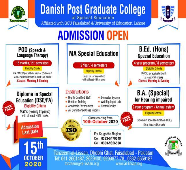 Last date to apply for Danish Degree College DC Faisalabad admission 2025 is 15 October, 2020