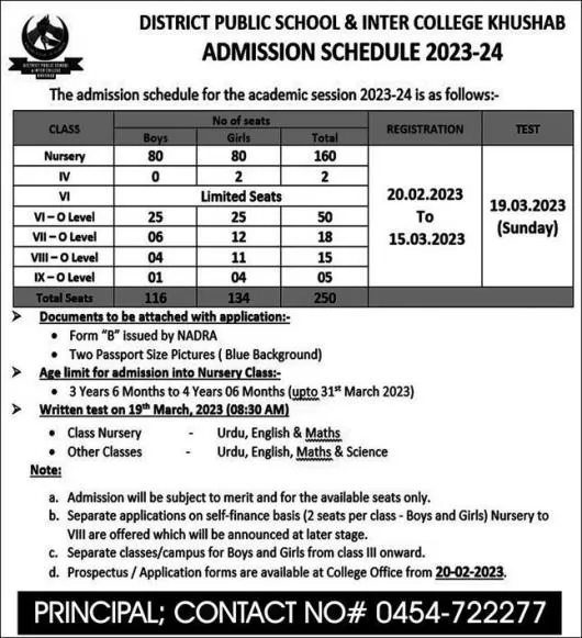 District Public School & Inter College Khushab admission office has announced that admission are open for session 2026.