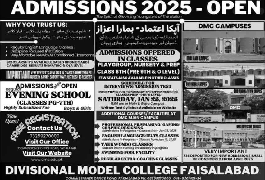 Last date to apply for Divisional Model College DMC Faisalabad admission 2026 is 24 January, 2025