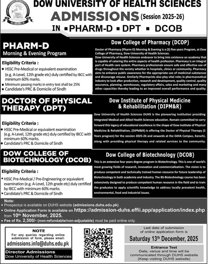 Last date to apply for Dow University Of Health Sciences DUHS Karachi admission 2025 is 13 December, 2025