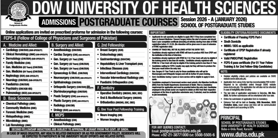 Last date to apply for Dow University Of Health Sciences DUHS Karachi admission 2025 is 08 November, 2025