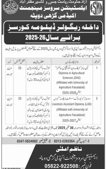 Last date to apply for Extension Services Management Academy, Garhi Dupatta ESMA Muzaffarabad admission 2025 is 30 September, 2025