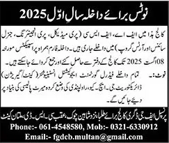 Last date to apply for Federal Government Degree College For Boys FGDC Multan admission 2026 is 08 August, 2025