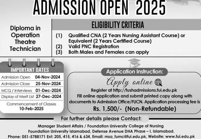 Last date to apply for Foundation University FU Islamabad admission 2026 is 25 November, 2024