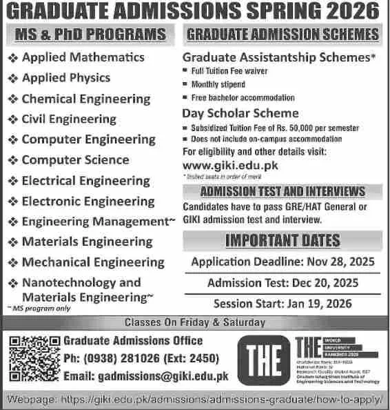 Last date to apply for Ghulam Ishaq Khan Institute Of Engineering Sciences & Technology GIKI Swabi admission 2025 is 28 November, 2025