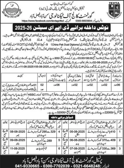 Government College Of Technology [ Samanabad] Faisalabad Admission 2025 Last date