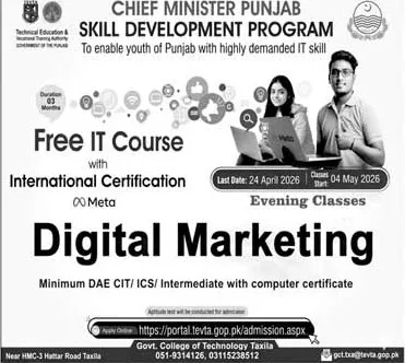 Last date to apply for Government College Of Technology GCT Taxila admission 2026 is 24 April, 2026