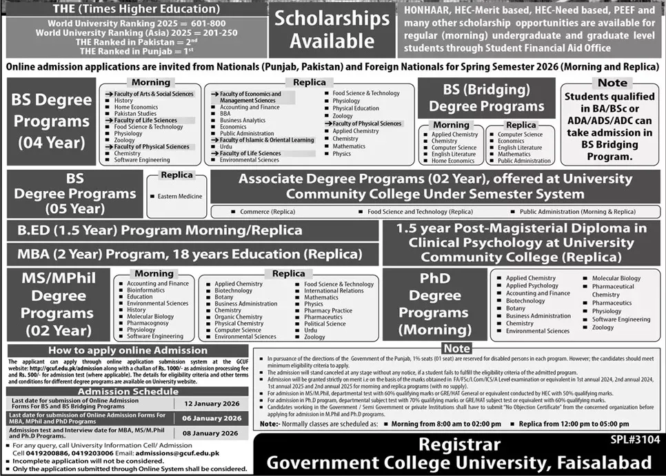 Last date to apply for Government College University GCU Faisalabad admission 2026 is 12 January, 2026