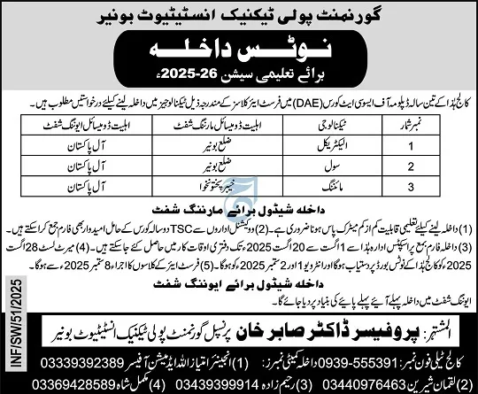 Government Polytechnic Institute ( Swarhi) Buner admission office has announced that admission are open for session 2025.