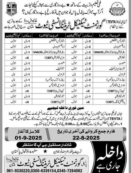 Last date to apply for Government Technical Training Institute [khanewal Road] Multan admission 2026 is 22 August, 2025