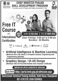 Last date to apply for Government Technical Training Institute, Murree Road GTTI Rawalpindi admission 2026 is 10 February, 2025