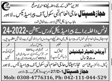 Haji Inam Elahi School Of Paramedics Lahore admission office has announced that admission are open for session 2025.