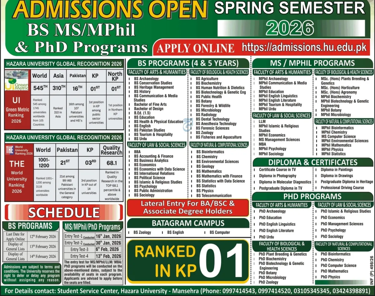 Hazara University Mansehra admission office has announced that admission are open for session 2026.