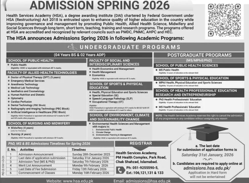Health Services Academy HSA Islamabad Admission 2026 Last date