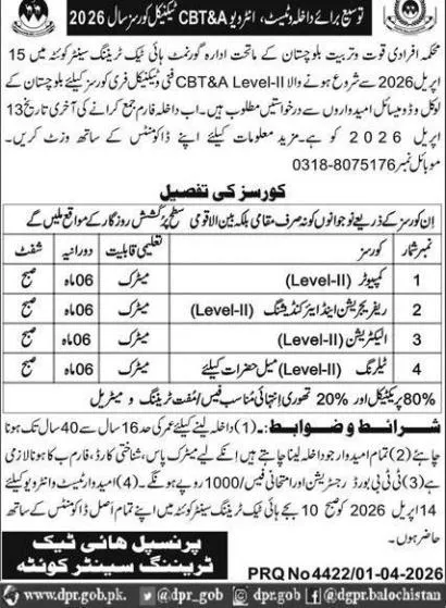 Last date to apply for Hitech Training Centre HTC Quetta admission 2026 is 13 April, 2026