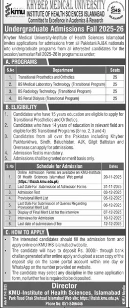Last date to apply for Institute Of Health Sciences IHS Islamabad admission 2025 is 30 November, 2025