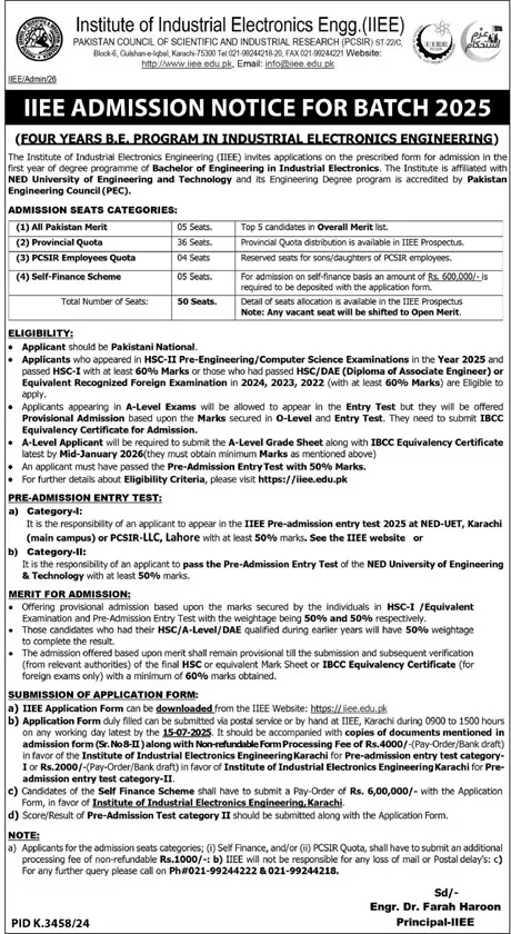 Last date to apply for Institute Of Industrial Electronics Engineering IIEE Karachi admission 2026 is 15 July, 2025