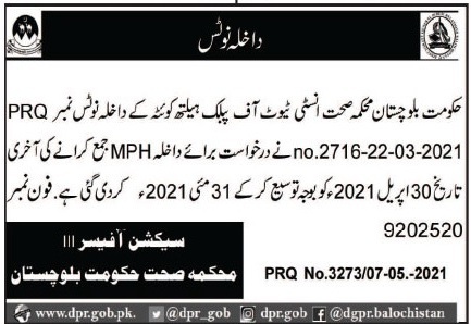 Interested applicants are informed that Institute Of Public Health, Quetta admission are open and you can submit the applicaiton at the earliest time.