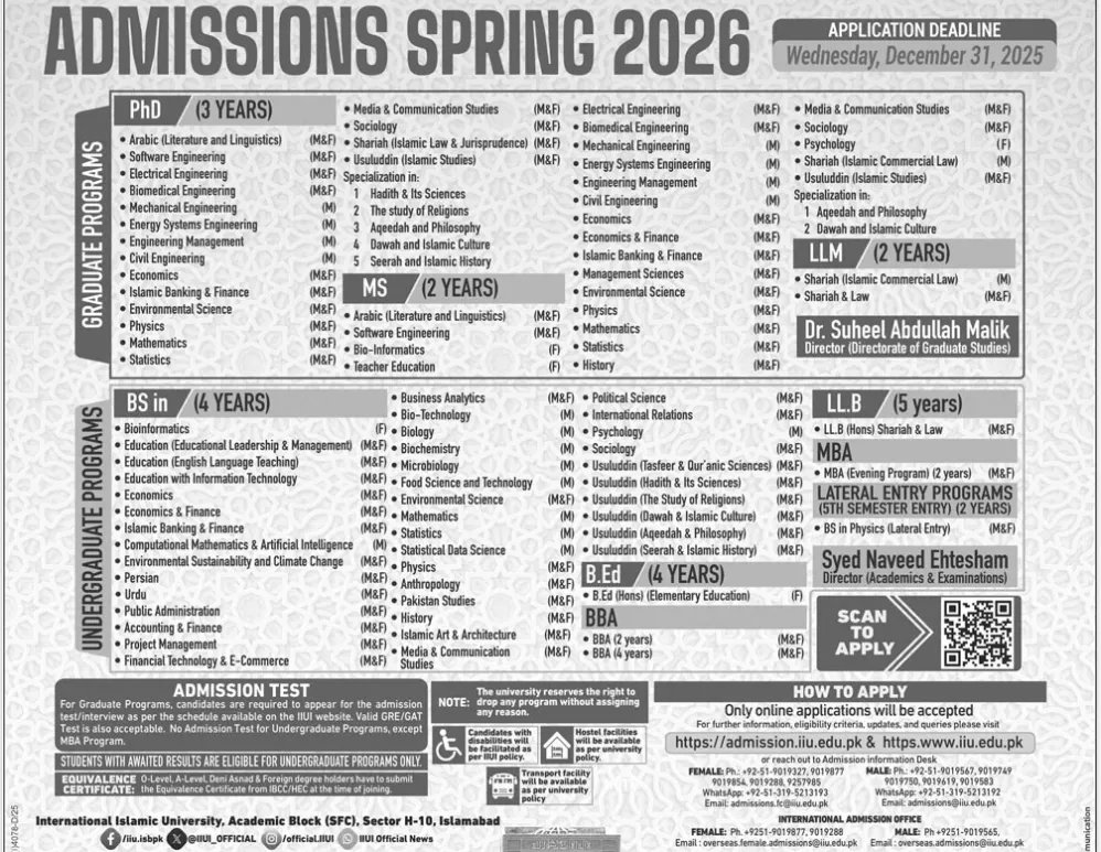 Last date to apply for International Islamic University IIU Islamabad admission 2025 is 31 December, 2025
