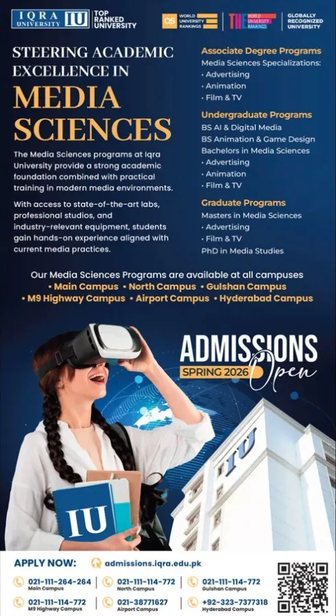 Iqra University [kch] Karachi admission office has announced that admission are open for session 2026.