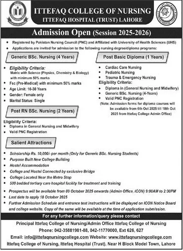 Last date to apply for Ittifaq College Of Nusing ICN Lahore admission 2025 is 18 October, 2025