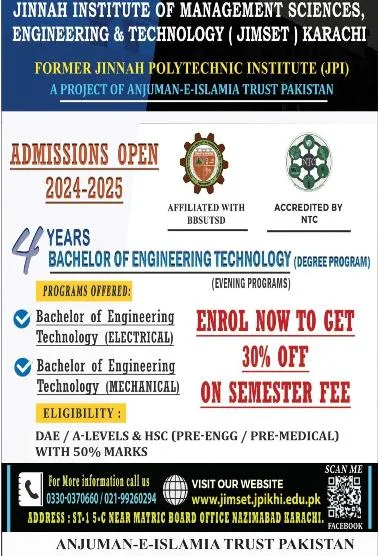 Jinnah Institute Of Management Sciences, Engineering & Technology JIMSET Karachi Admission 2026 Last date