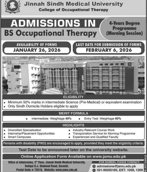 Last date to apply for Jinnah Sindh Medical University JSMU Karachi admission 2026 is 06 February, 2026