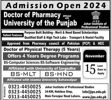 Last date to apply for Johar Institute Of Professional Studies JIFS Lahore admission 2025 is 15 November, 2024