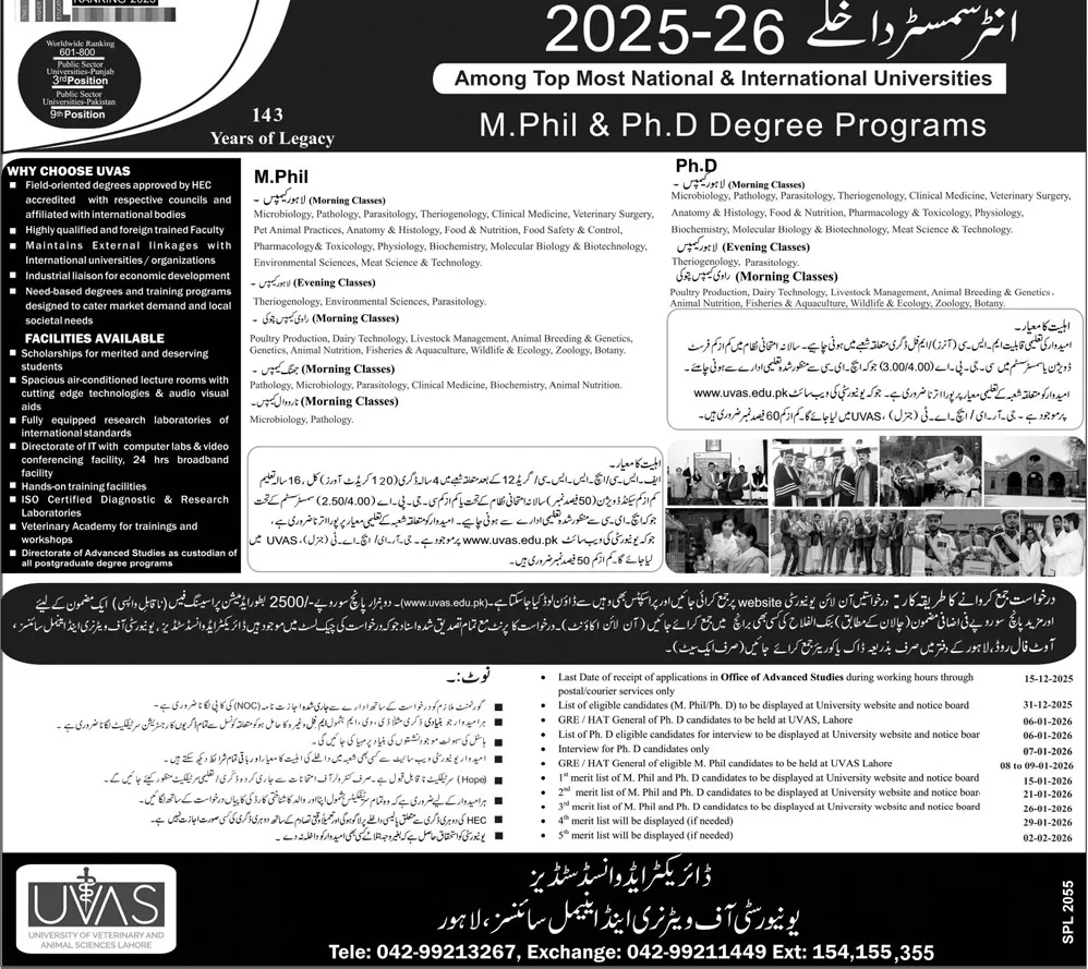 Last date to apply for Khan Bahadur Chaudhary Mushtaq Ahmad College Of Veterinary And Animal Sciences KBCMACVAS Narowal admission 2025 is 15 December, 2025