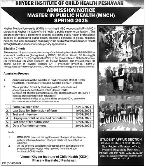 Last date to apply for Khyber Institute Of Child Health KICH Peshawar admission 2026 is 10 January, 2025