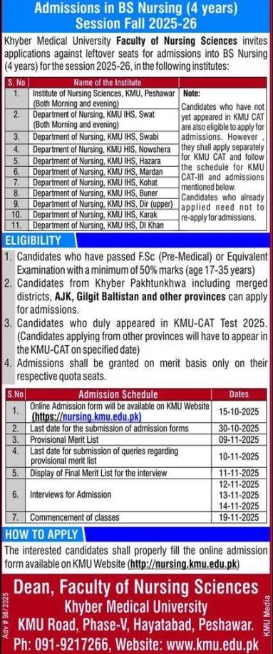 Last date to apply for Kmu Institute Of Health Sciences, Kohat KMUIHS Kohat admission 2025 is 30 October, 2025