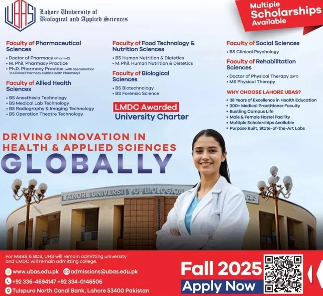 Last date to apply for Lahore University Of Biological & Applied Sciences UBAS Lahore admission 2025 is 30 August, 2025
