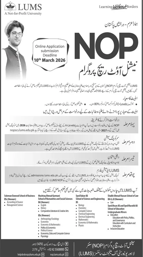 Last date to apply for Lahore University Of Management Sciences LUMS Lahore admission 2025 is 10 March, 2026